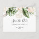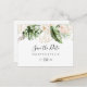 This gold tropical foliage horizontal save the date postcard is perfect for a rustic wedding. The design features hand-painted watercolor gold and tropical green foliage with elegant blush flowers.