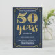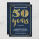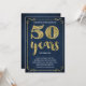 This swanky, stylish 50th birthday party invitation features vintage typography, elegant flourishes, brush script calligraphy, faux gold foil, and a chic navy blue background. Add photos or additional text to the back of the card if desired.
