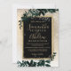 A modern, chic and elegant gold typography Floral green watercolor Christmas winter wedding party invitation with hand painted green watercolor leaf foliage on a chic yellow gold gradient with white snow and snowflakes..