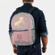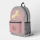 On this back pack is a gold shimmery unicorn on a coral pink backdrop with faux silver glitter edging for extra glam. Can be personalised on the front pocket. Whimsical glittery girly vibes.
