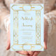 This elegant vintage-inspired wedding invitation features gold-coloured text on a pastel baby blue background, framed by a stylish vintage geometric art deco border in faux gold foil. The reverse side is solid blue.
