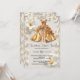 A beautiful white background has faux gold and white delicate swirls around the edges and two pretty white lilly flowers. An exquisite golden ballgown adorned with golden roses appears to the right of the flower. The ball gown has ruffles and a tight off the shoulder bodice that pops against the stark white backdrop. Below the dress are customisable calligraphy text templates. This luxury invitation is ideal for a summer, spring or fall (autumn) wedding that is being held in a garden or outdoor venue. Celebrate the bride to be with this elegant, trendy and modern design that is ideal for a bridal shower, Quinceañera or business launching their new range of evening wear and wedding dresses to clients.