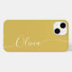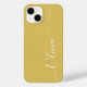Gold White Elegant Calligraphy Script Custom Personalised Name iPhone 14 Smart Phone Cases features a modern and trendy simple and stylish design with your personalised name in elegant hand written calligraphy script typography on a gold background. Designed by ©Evco Studio www.zazzle.com/store/evcostudio