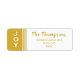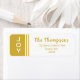 A gold band down the left side of the label has the word JOY in a simple white font. The rest of the label is white with your name and return address in a gold typography.