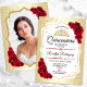 Gold white red Quinceanera celebration invitation. Features script font, red roses, tiara and glitter gold. Classy design with photo on the back. Perfect for an elegant princess style glam celebration. Personalise with your own details. Printed Zazzle invitations or instant download digital printable template.