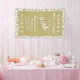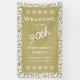 Welcome to my 90th Birthday Party. A large gold and white banner with white text and templates to make it easy for you to change to your own words, names, and dates. You can personalise all of the text using the supplied templates. The sign is trimmed with stars and crosshatch lines. The frame is a random collage pattern of the number 90. A great gold and white birthday party theme for an over-the-hill celebration.