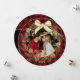 Buffalo plaid with gold wreath frame round Christmas Holiday greeting card with photo. A simple hole punch and ribbon and this adorable card easily could become a decoration or tree ornament.