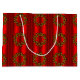 A colourful Christmas gift bag featuring a pattern of golden Christmas wreaths on a metallic red background to add a little festive colour and style to your gift giving this holiday season.