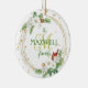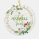 This lovely ornament features a gold wire wreath with two clusters of white berries, petunias, holly and pine branches, pine cones and vintage Victorian ornaments hanging from the top. A red cardinal is sitting on a petunia trying to nibble on the pinecone. Personalise the centre with your monogram and family name. Gold stars are twinkling all around which adds to the elegance of this Christmas ornament. Perfect for gift giving to a friend or co-worker. Design is the same on the back so it won't matter if it turns around on the tree!