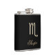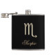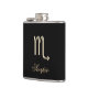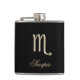 Gold Zodiac Sign Scorpio on Black Flask. A handy pocket flask with a Gold astrological symbol for zodiac sign Scorpio the Scorpion with gold trim, and the word Scorpio written in metallic gold script. Keep your favourite Scorpio happy and help them celebrate!
