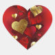 Vertical composition of red and gold, textured valentines made of foil and brocade on red background. Valentines day decorations.