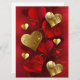 Vertical composition of red and gold, textured valentines made of foil and brocade on red background. Valentines day decorations.