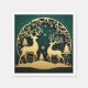 ‘Golden Antler Grove – Snowflake Arch’ captures the quiet magic of a winter’s night in rich emerald and gold. Two graceful reindeer stand beneath a swirling arch of foliage and snowflakes, their ornate antlers echoing the curves of the landscape. Stylised trees and falling snow add depth and wonder, while the circular framing evokes handcrafted charm and seasonal sophistication.