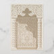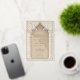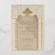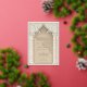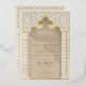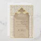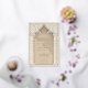 This invitation is a luxurious statement piece, perfect for couples seeking to blend traditional Islamic design with modern elegance. Its golden foil accents illuminate the intricate lace motif, creating a striking contrast against the taupe and beige background. The architectural elements echo the grandeur of a mosque’s entrance, with chevron-patterned columns framing the card and a beautifully stylised arch crowning the text. The use of cream, ecru, and gold hues exudes opulence, while the fine detail in the artwork reflects a deep respect for cultural artistry. This invitation promises a celebration where timeless beauty and contemporary style converge to create an unforgettable experience.