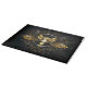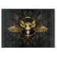 Artistically drawn, symmetrical, composition of black and gold, bird wings, golden, bird skull decorated with gilded pattern on dark, textured background.Gothic style