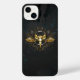 Artistically drawn, symmetrical, composition of black and gold, bird wings, golden, bird skull decorated with gilded pattern on dark, textured background.Gothic style