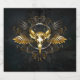 Artistically drawn, symmetrical, composition of black and gold, bird wings, golden, bird skull decorated with gilded pattern on dark, textured background.Gothic style