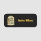 This name tag is black with a golden birdcage that has a bird on a branch overlooking a winter cabin scene with snow inside the cage. Customise your name with the template.