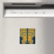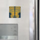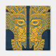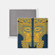 A pair of Aztec inspired masks are face at each other creating the appearance of a third mask looking forward. The intricate lines and circles are painted a golden yellow colour that is highlighted to produce a subtle shine on the surface. The interior and background of the image is finished with deep blue shades that run down the middle of the design in between the two masks. The tight cropping of the image creates an aggressive pattern that really stands out on this magnet. This stylish Aztec design has the look of being an ancient artefact with a modern feel.
