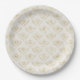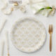 Paper plates with an elegant pattern with gold coloured bumble bees in a repeating pattern on a cream coloured background.