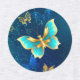 Flying gold, jewellery butterfly on blue textural background. Design with butterflies.