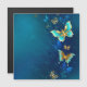 Flying gold, jewellery butterfly on blue textural background. Design with butterflies.