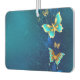Flying gold, jewellery butterfly on blue textural background. Design with butterflies.