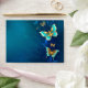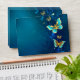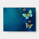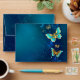 Flying gold, jewellery butterfly on blue textural background. Design with butterflies.
