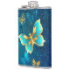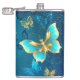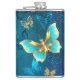 Flying gold, jewellery butterfly on blue textural background. Design with butterflies.