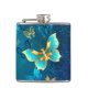 Flying gold, jewellery butterfly on blue textural background. Design with butterflies.