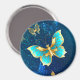 Flying gold, jewellery butterfly on blue textural background. Design with butterflies.