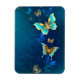 Flying gold, jewellery butterfly on blue textural background. Design with butterflies.