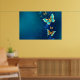 Flying gold, jewellery butterfly on blue textural background. Design with butterflies.
