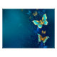 Flying gold, jewellery butterfly on blue textural background. Design with butterflies.