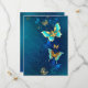 Flying gold, jewellery butterfly on blue textural background. Design with butterflies.