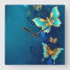 Flying gold, jewellery butterfly on blue textural background. Design with butterflies.