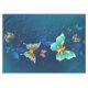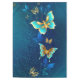 Flying gold, jewellery butterfly on blue textural background. Design with butterflies.