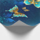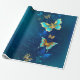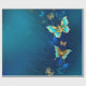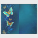Flying gold, jewellery butterfly on blue textural background. Design with butterflies.