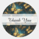 A set of elegant thank you round stickers with a butterflies pattern in glittering golden hues and glowing blues.