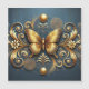 An artistic depiction of an ornate golden butterfly surrounded by elegant floral and ornamental curls on a contrasting blue background, enhancing themes of luxury, elegance, and decor.