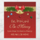 Christmas wine label with golden bells, colourful baubles and branchet of spruce set against a red background with golden ribbon