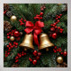 Golden bells tied with a red bow are surrounded by evergreen branches adorned with red berries, golden baubles, and festive ornaments, capturing the classic essence of holiday and Christmas celebrations.