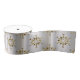An elegant Christmas ribbon featuring a pattern of gold stars resembling golden snowflakes on a silver/grey background.