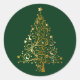 Christmas tree in shades of golden yellow shading to simulate metallic gold. The Christmas tree is comprised of sweeping lines with star ornaments and topped with a gold star. Set on dark green.