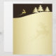 Elegant gold Christmas illustration featuring a golden silhouette of a reindeer and tree with Merry Christmas greeting on a brown background.