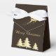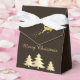 Elegant gold Christmas illustration featuring a golden silhouette of a reindeer and tree with Merry Christmas greeting on a brown background.
