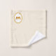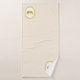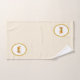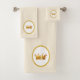 Elegant towel set with beautiful golden and red crown on sand beige background. Chic modern towel set.