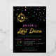 Disco themed bachelorette party invitation in gold and black with neon coloured stars and flares. The bachelorette's last disco invitation in neon colours and gold foil.