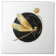 Artistically painted, gold, jewellery, sparkling dragonfly with detailed, filigree wings on golden wild flower, against black textured circle. Golden dragonfly.