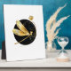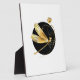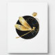 Artistically painted, gold, jewellery, sparkling dragonfly with detailed, filigree wings on golden wild flower, against black textured circle. Golden dragonfly.